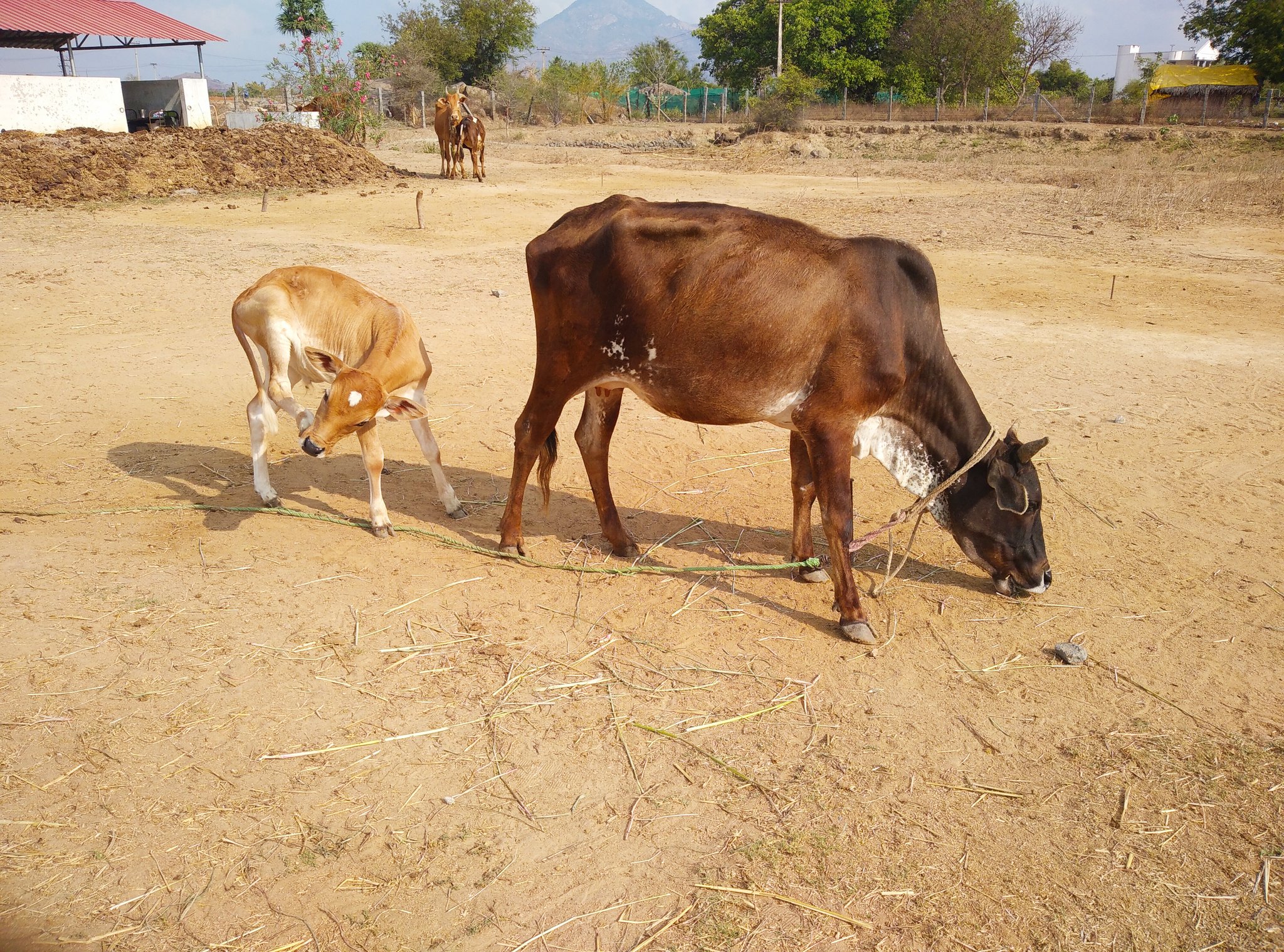 Our Sakthi came to us from one native cow breeds breeder, Mr. Selva, who in lack of space donated her to us. Sakthi is a pure, Tamil Nadu native breed called Umblachery, mostly known in Tiruvaroor and Nagapatinam districts. The breed is small, and when Sakthi came, her size was that of the calves in the herd. She has always been very self-relient, and found her grazing where ever the disturbance would be smallest. Yet, when we made friends with her, she would not miss a morning to come to us to have her share of sweet talk and rubbing.