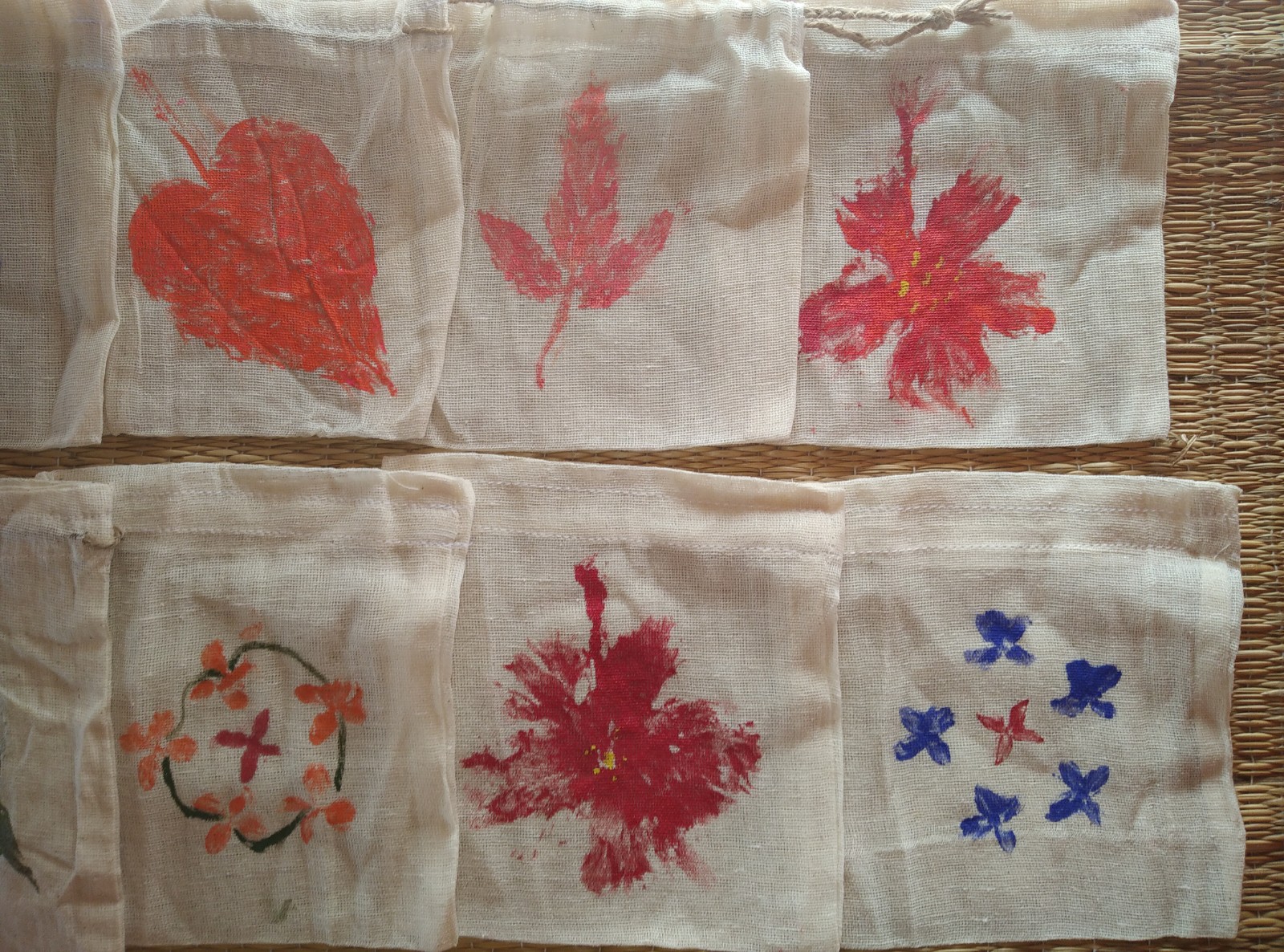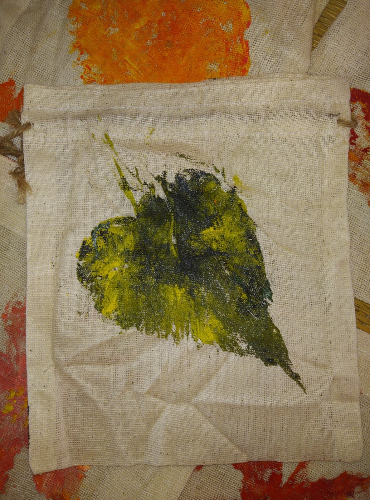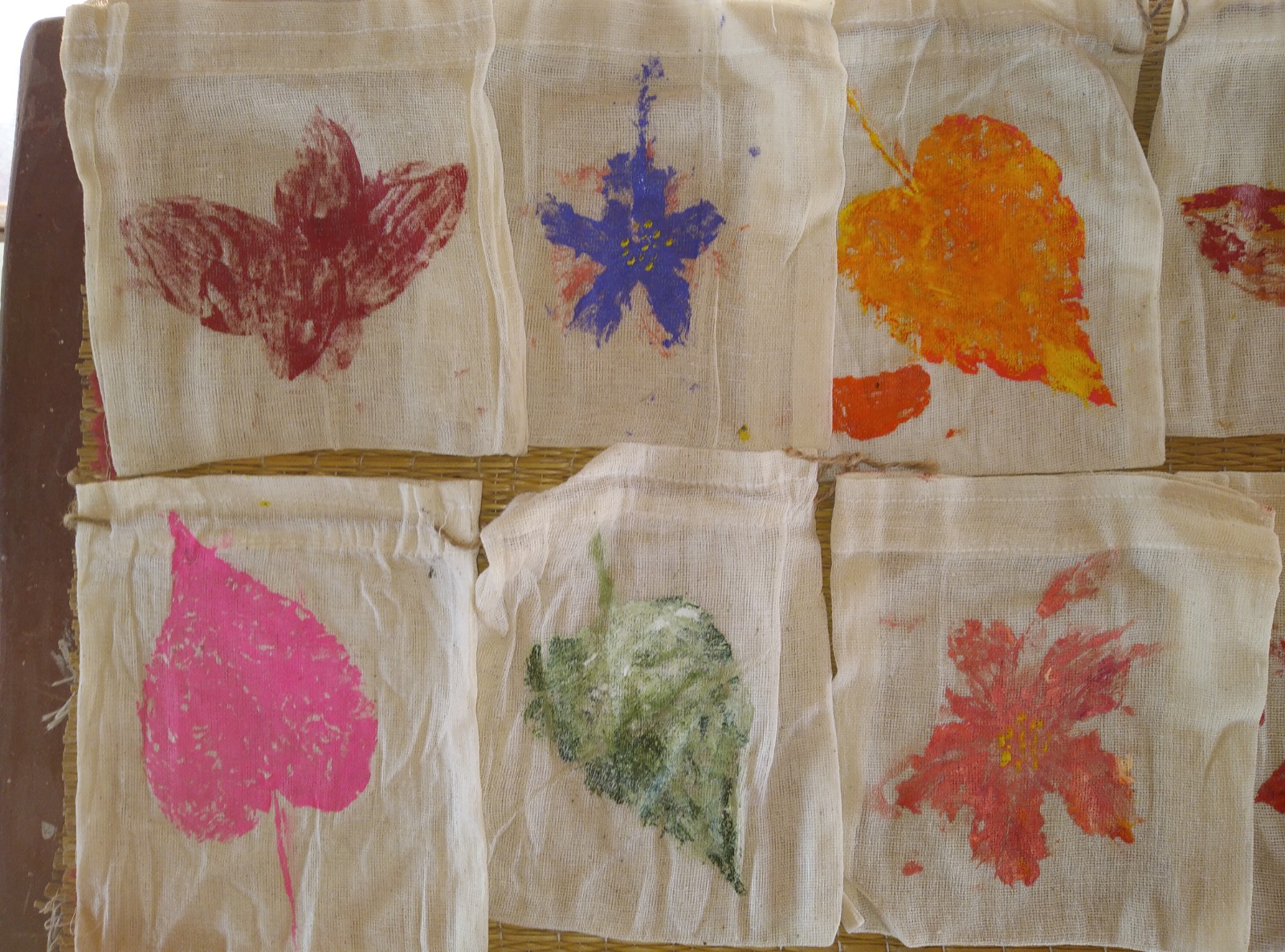 On our daily walks children pick some leafs and flowers, which we use to paint these pouches. Above are some results from the work of children, in picking, colouring and impressing.