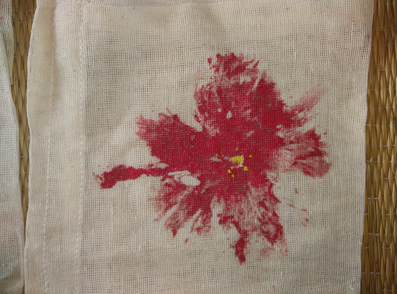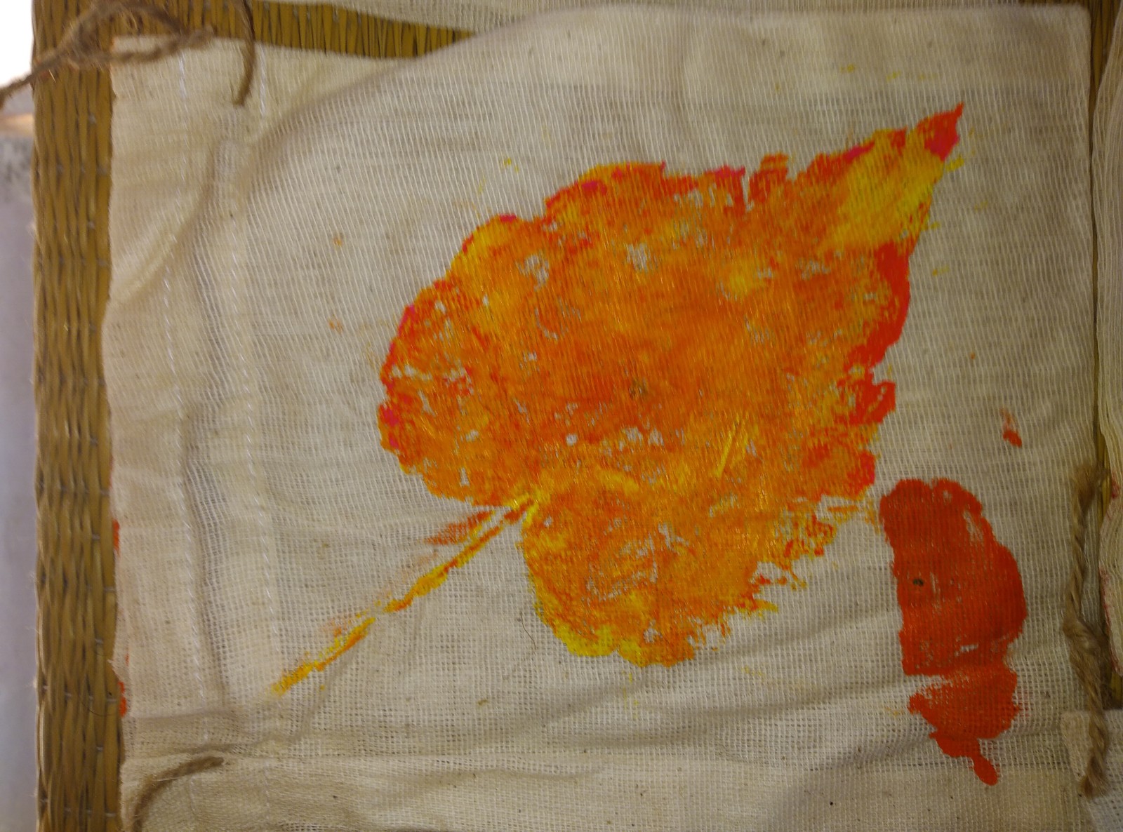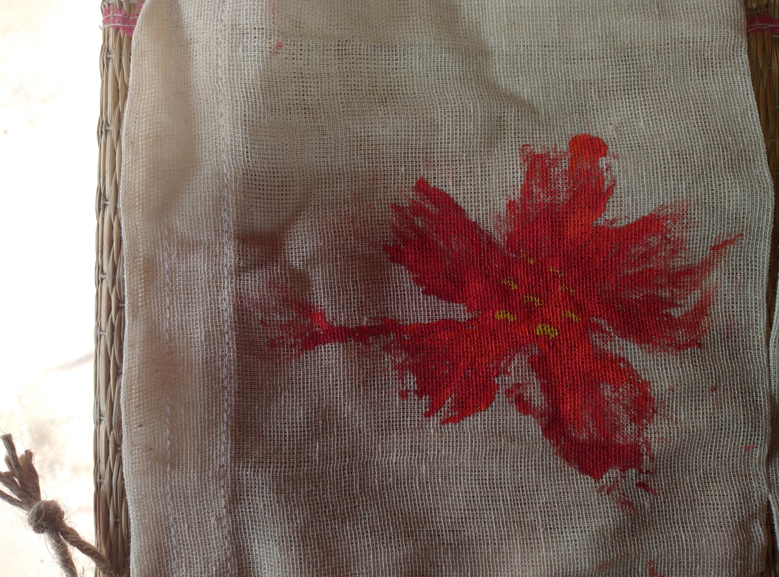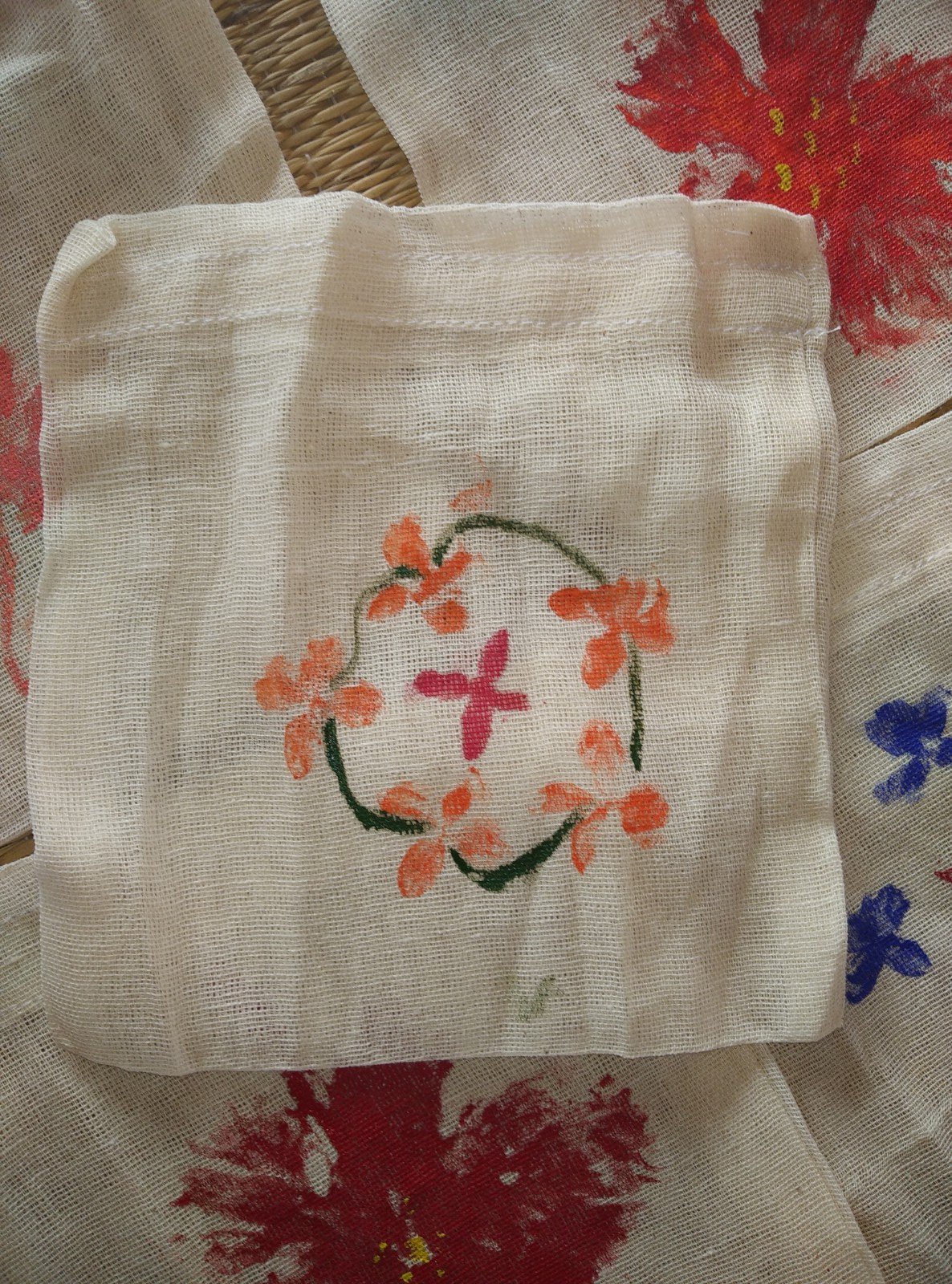 On our daily walks children pick some leafs and flowers, which we use to paint these pouches. Above are some results from the work of children, in picking, colouring and impressing.