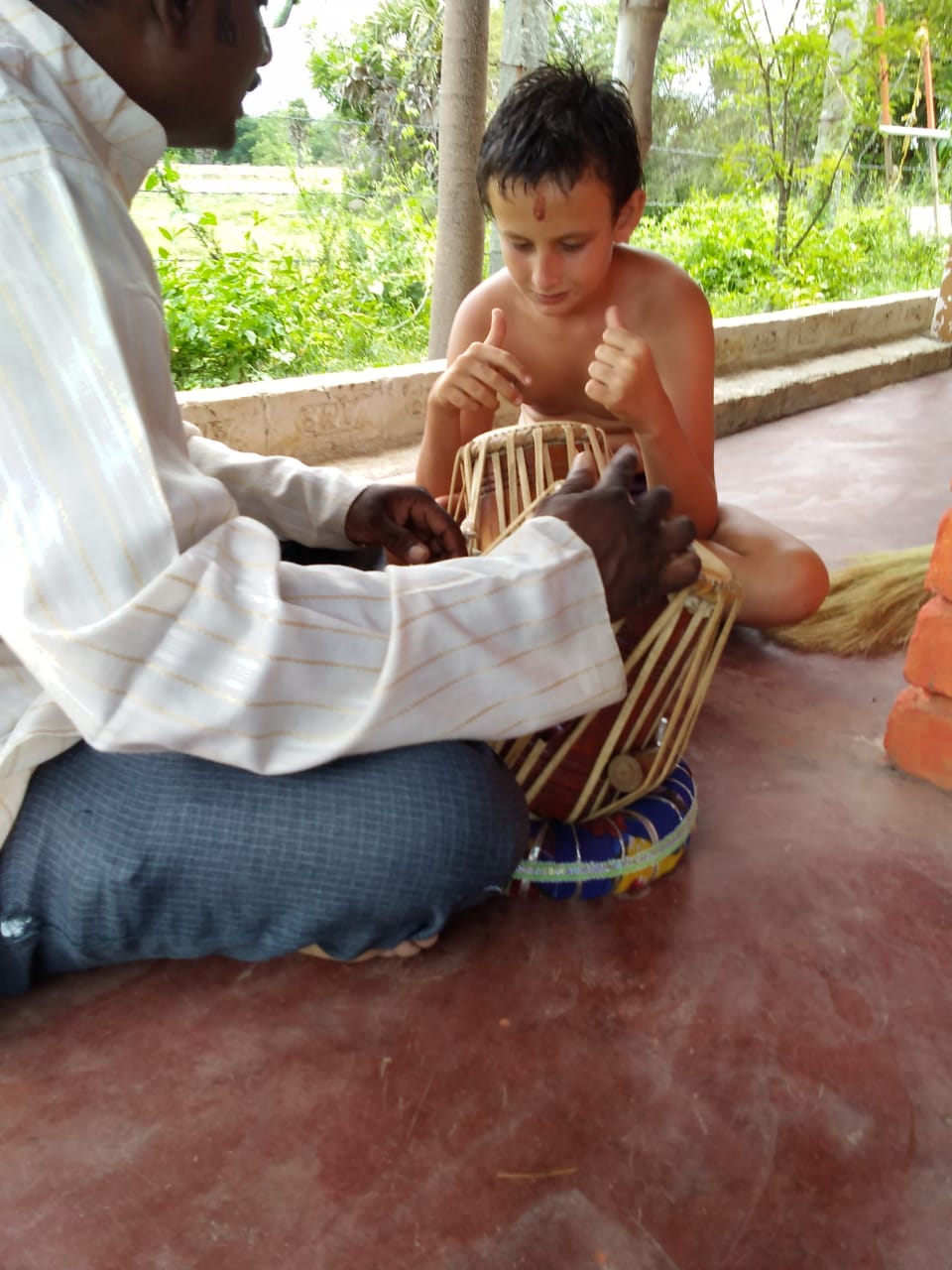 As many kids showed interest in music, we were allowed to respond to that call. By grace alone we met one drums master Bharathi, and a keyboard teacher Hari; both well-versed with children and teaching. For almost a year, they have been giving classes to kids 3 to 4 times a week. A delight for many. As a climax of this routine, the whole bunch of our kids went and performed in the biggest festival, Shiva Ratri, in Annamalayar Koyil, the main temple of Tiruvannamalai. A night full of bliss and grace.
